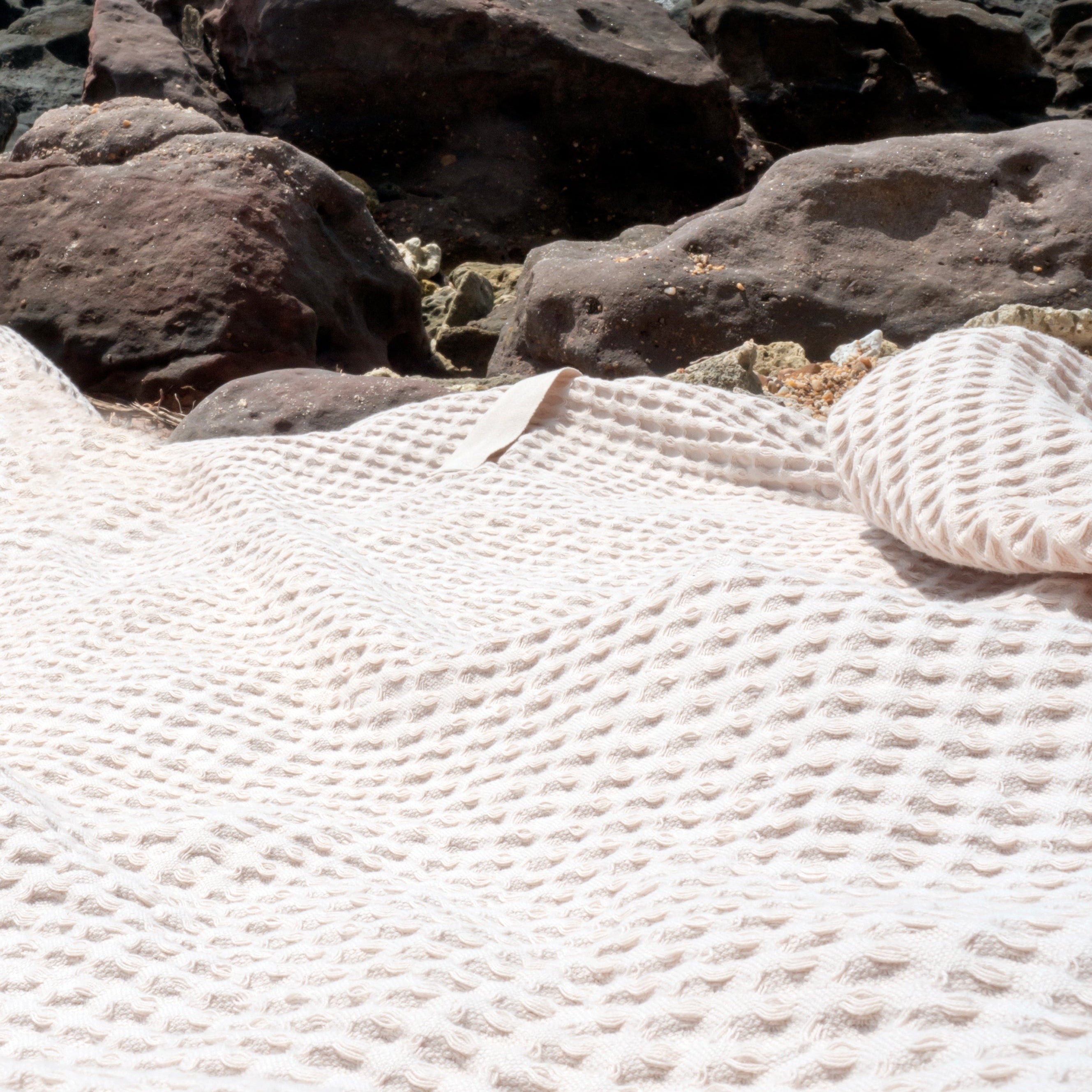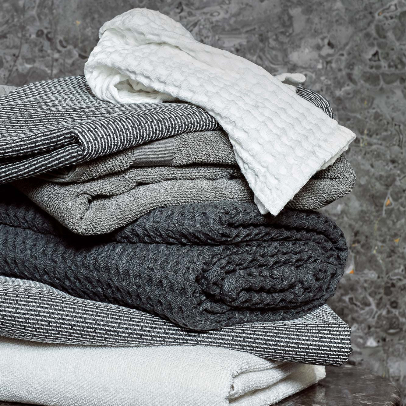 Waffle is a lightly woven fabric (also known as honeycomb) where the pattern runs either vertically, horizontally or both, creating a square design, hence the name waffle. This weave is absorbent, lively and quick drying.